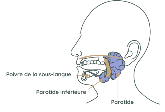 Il existe trois grandes paires de glandes salivaires différentes. Les plus grandes sont les glandes parotides (Glandula parotis, Glandula parotidea), situées juste derrière l’articulation de la mâchoire, sous et devant les oreilles. Deux paires de plus petite taille, les glandes sous-maxillaires (Glandula submandibularis) et les glandes salivaires sublinguales (Glandula sublingualis) sont logées dans le plancher buccal, contre le bord de la mandibule inférieure et sous la langue. En plus de ces trois paires, il y a de nombreuses petites glandes salivaires réparties dans toute la bouche.